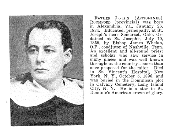 The Dominican Province of Saint Joseph. Historico-Biographical Studies (New York: Holy Name Society, 1942): “Father John Antoninus Rochford was born in Alexandria, Virginia, January 27, 1834, and was one of the large family of Bartholomew and Jane (Carne) Rochford. He began his education in his home town, and was sent to Georgetown College (now University) when about twelve years of age. From there he went to Saint Joseph’s College, Perry County, Ohio. While at this latter institution he entered the Order in the adjacent priory of the same name, where he made his religious profession on December 3, 1854. As was then the usual routine, he helped with the teaching in the college and at the same time prosecuted his own ecclesiastical studies. Through industry combined with a very bright mind he acquitted himself with great credit both as student and professor. Bishop James Whelan, coadjutor to Nashville, ordained him at Saint Joseph’s on July 10, 1859. Shortly after ordination the promising young priest was sent to the college at Sinsinawa, Wisconsin. There he taught, amongst other things, music and English literature. But in 1860, Father Michael D. Lilly having resigned his position as president of Saint Joseph’s College, in Ohio, Father Rochford was brought back there to take his place. However, as has been seen, this educational institution was suspended the next year supposedly for the duration of the Civil War.